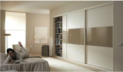 Armarios empotrados a medida de tres puertas correderas, perfileria en blanco y combinación de cristal lacado blanco y cristal opaco lacado color